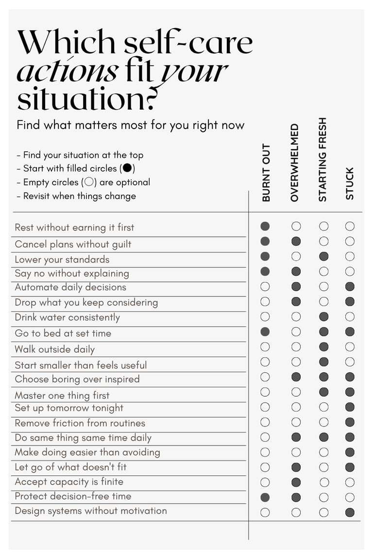 What helps: rest without justifying it. Cancelling plans without elaborate explanations. Lowering your standards until they're embarrassingly low. Choosing survival mode deliberately instead of pretending you're fine.